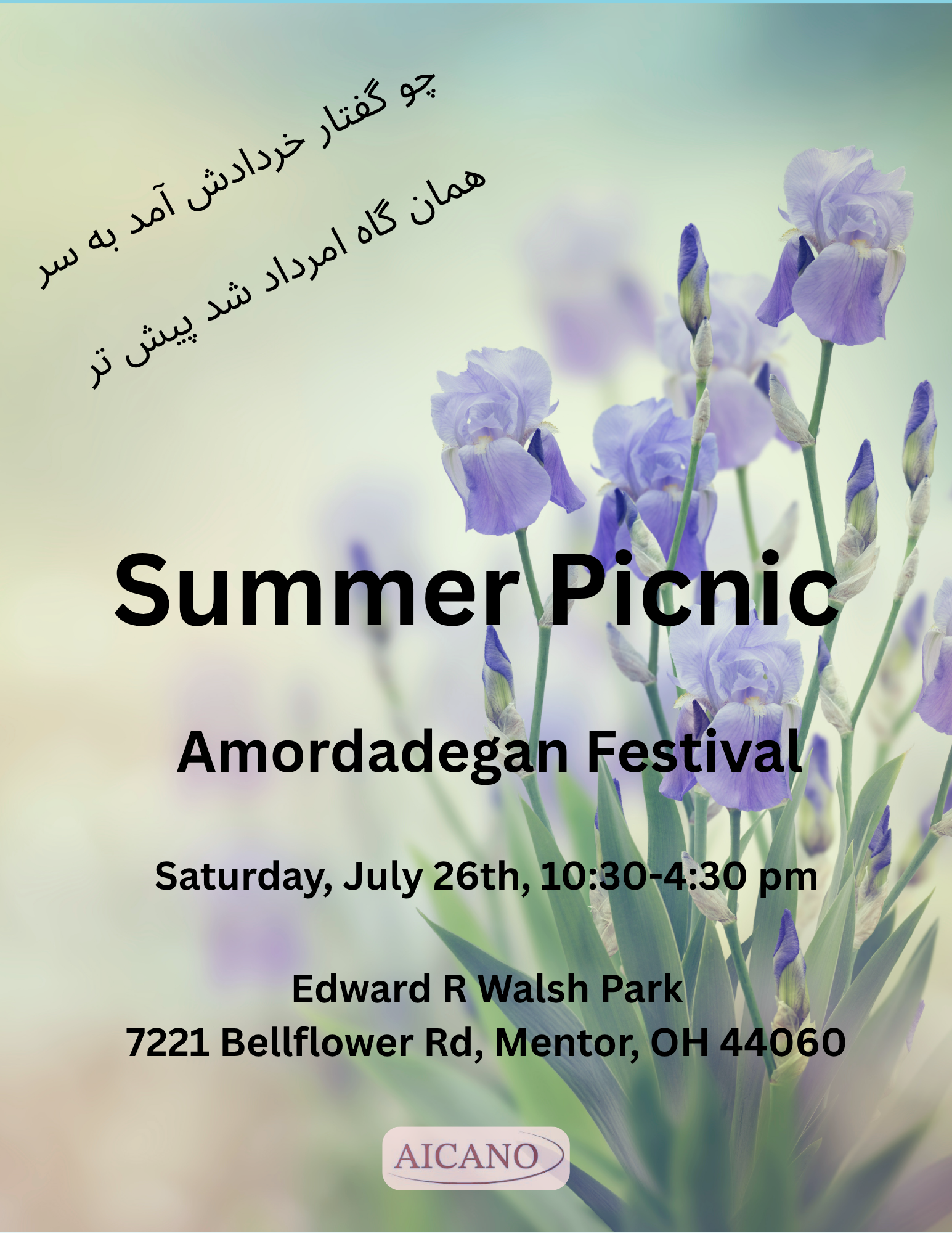 Edward R Walsh Park 7221 Bellflower Rd, Mentor, OH, United StatesSummer Picnic Mordadgan 2025 Join us for music, food, cold drinks, and AICANO’s 1st birthday & Mordadgan 🎉 📅 July 26, 2025 🕥 10:30 AM – 4:30 PM 📍 Edward R. Walsh Park – Mentor, OH 🎂 Celebration: 12 PM 💦 Splash park- bring towels & change of clothes! 💵 $5 per adult (for park […]